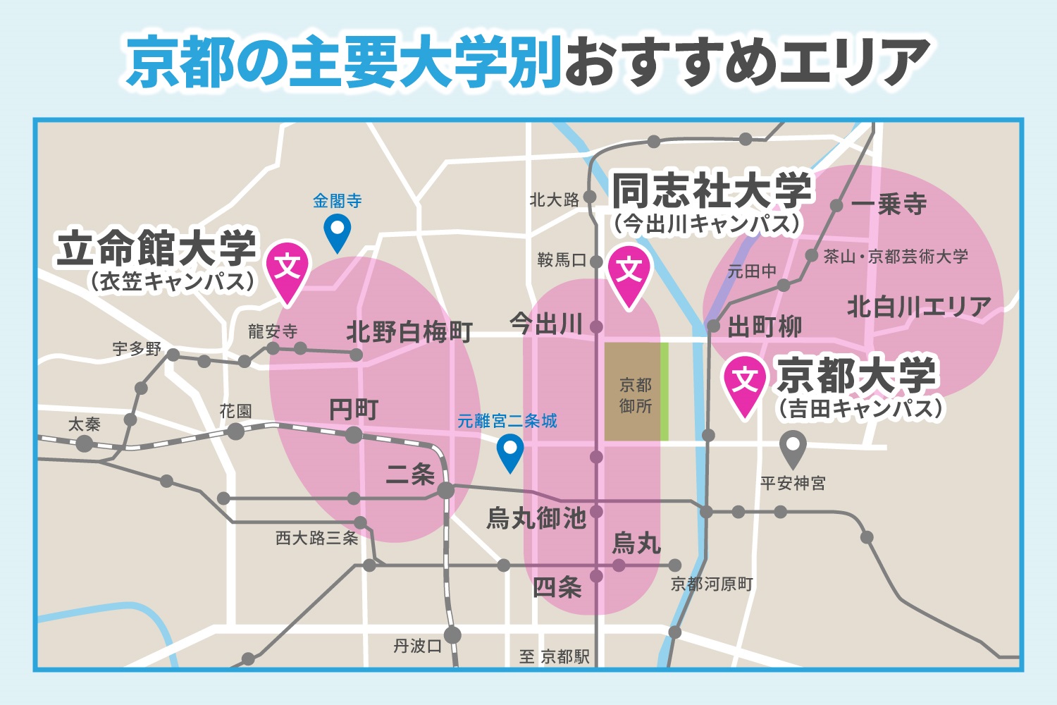 では、京都の大学に通うなら、どのエリアに住むと良いのでしょうか。主要な大学ごとのおすすめエリアとその特徴について解説していきます。