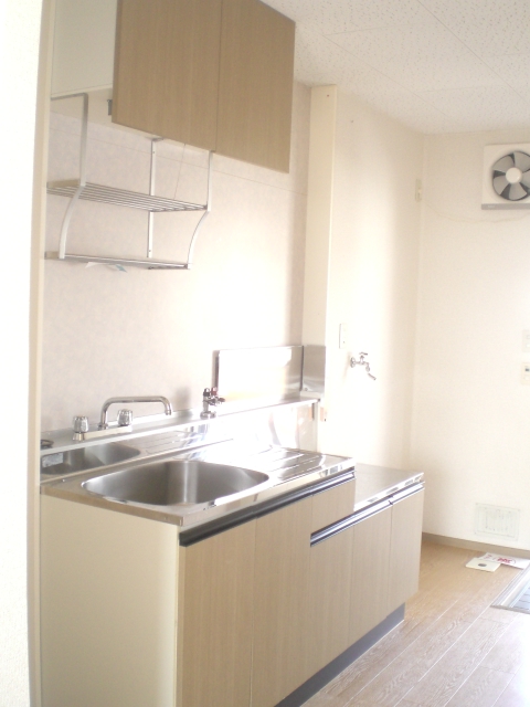 キッチンは2口ガスコンロ備え付け、持ち込みしなくて良いのが利点です♪
