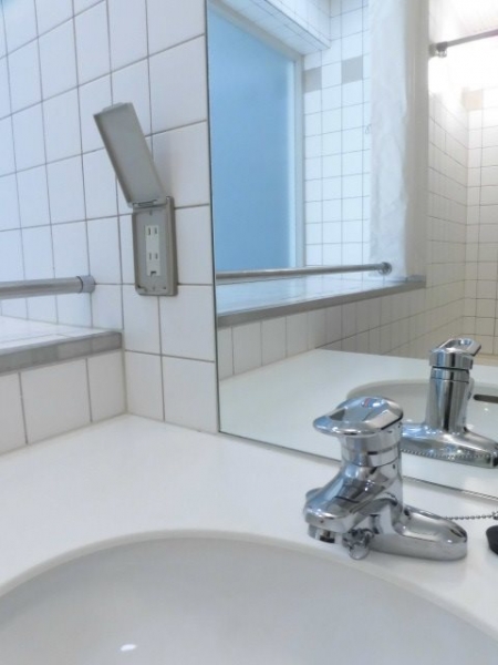 温度調節の容易なシングルレバー混合栓、蓋付きのコンセント(2口)あり